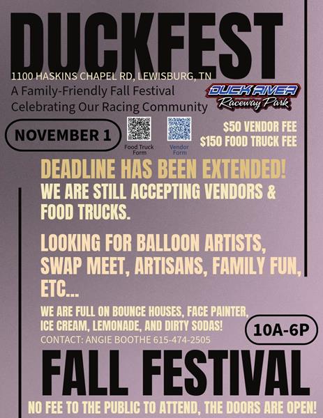 Duckfest returns to Duck River Raceway Park on Saturday, November 1, 2025, bringing a full day of fall fun for families, fans, and our community to enjoy.
