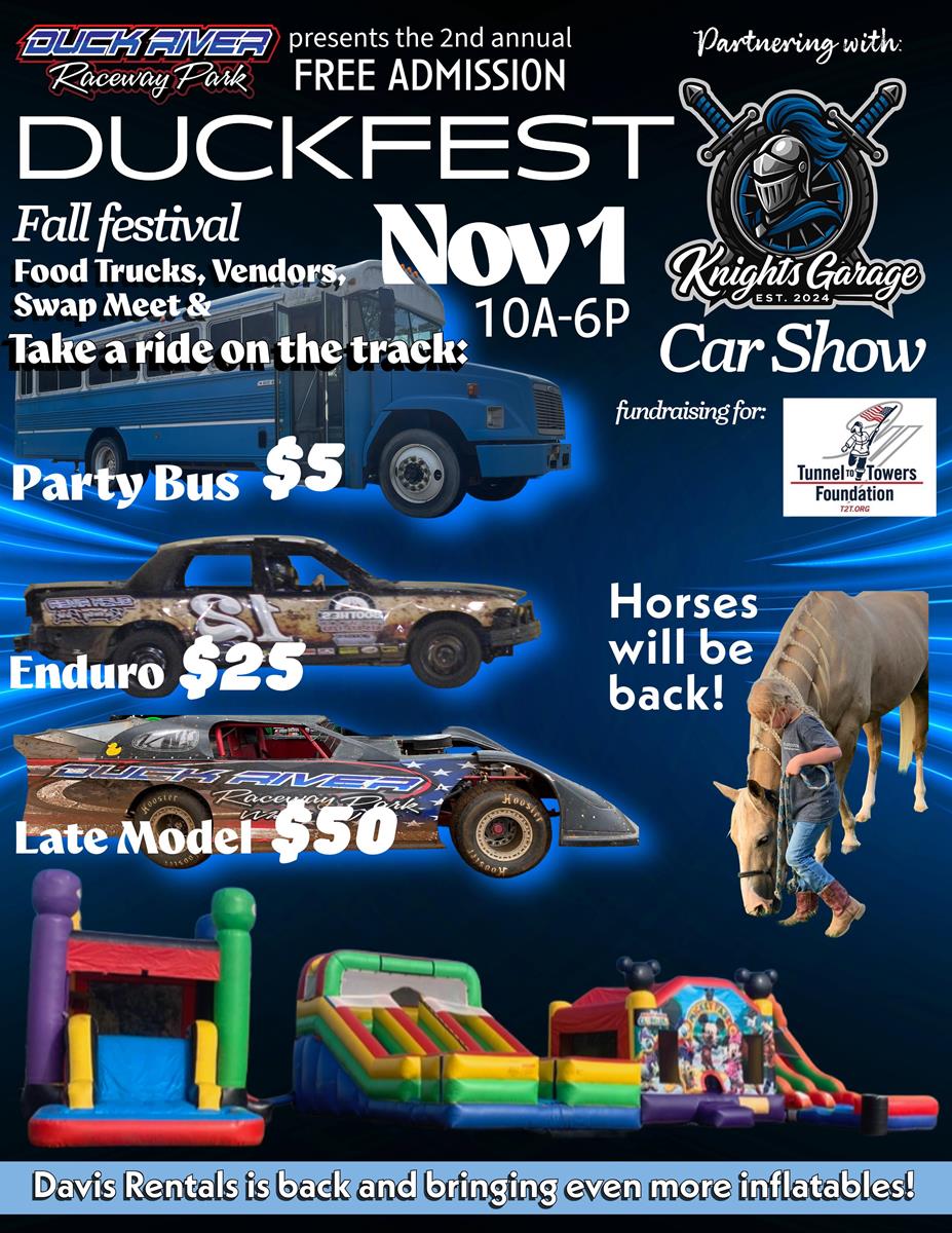 Duckfest returns to Duck River Raceway Park on Saturday, November 1, 2025, bringing a full day of fall fun for families, fans, and our community to enjoy.